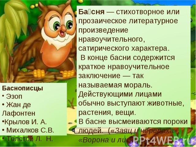 Басней называется стихотворное или прозаическое литературное произведение, которое носит поучительный сатирический характер.
