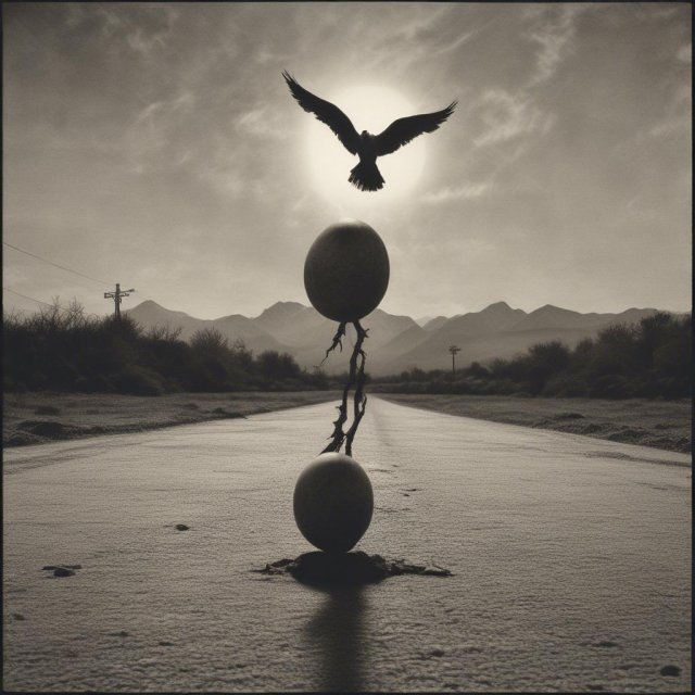 Двумя человеками.. небрежно взявшими яйцо… невольно.. посеяна вражда меж всех народов…. Лишь редкостный прохожий вдруг остановится, заметив «что там за птица реет надо мной? Так.. то знамение было? Все не спроста?...» да на одних полотнищах птица вся красная с крылом чернее нощи, а на других – вся синяя с крылом белее дня. Махнет рукой и побежит в путь свой (искать место тишей, сытней под стягом посильней).