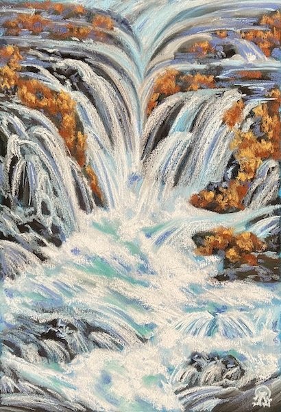 На фото работа автора. Водопады. Бумага, пастель. 50х35 см. 2022 г.