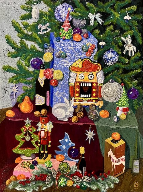На фото работа автора. Щелкунчик. Декоративный натюрморт. Холст, акрил. 80х60 см. 2023 г.