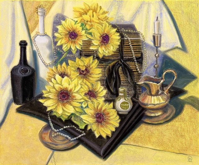 На фото работа автора. Натюрморт с подсолнухами. Бумага, пастель. 50х60 см. 2022 г.