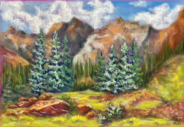 На фото работа автора. Ели и камни. Бумага, пастель. 35х50 см. 2022 г.