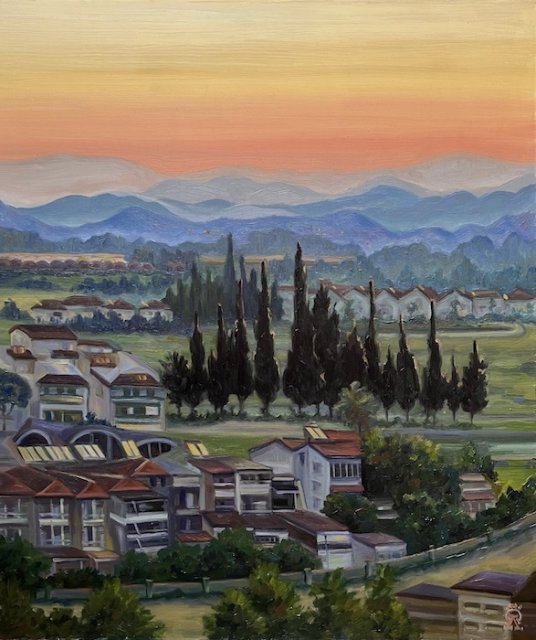 На фото работа автора. Кипарисы. Холст, масло. 70х60 см. 2023 г.