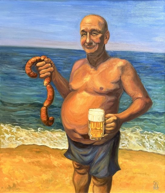 На фото работа автора. Море пива. Холст, масло. 70х60 см. 2024 г.