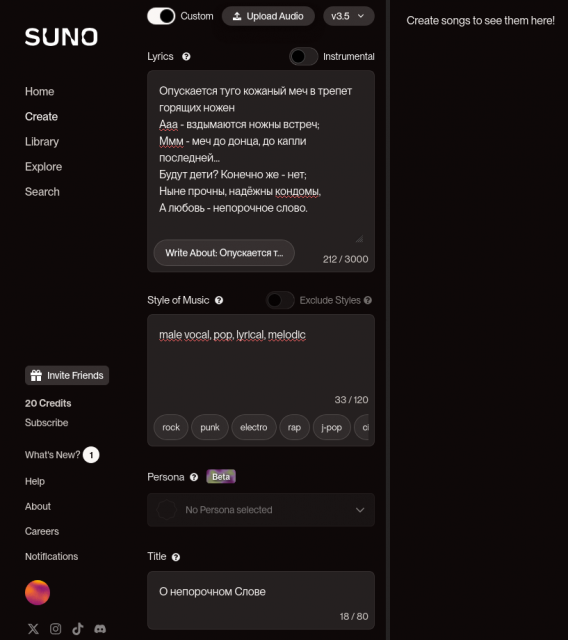 Приветик. Не разобрался - мышкой тыкал, тыкал.. чот там пишет о каких то долларах, потом хлобысь - два варианта озвучки выдало.. текст, ако при беседе с человеком, на свой лад поменяло... А что? - суно не должно текст менять? мож быть не то суно посунулось? Хотел еще раз попробовать - опять мне про каких то баксов, единственное внятное, мо, чего то 2, и подписаться. Куда подписаться? Вроде как регистрировался... В общем - завтра гляну - выскочит опять окошечко, нет? что после попытки напишет?