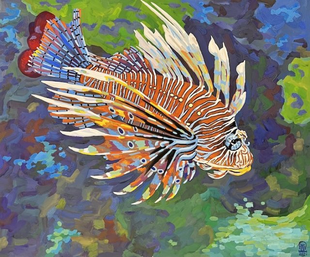 На фото работа автора. Тропическая рыба. Бумага, гуашь. 50х60 см. 2024 г.