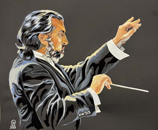 На фото работа автора. Дирижер. Бумага, гуашь. 50х60 см. 2024 г.