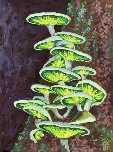 На фото работа автора. Люминисцентные грибы. Бумага, гуашь. 40х30 см. 2024 г.