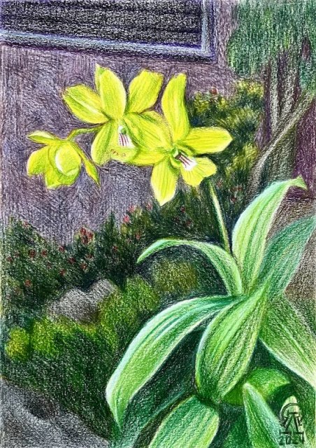 На фото работа автора. Пхукет. Орхидея. Скетч. Бумага, цветные карандаши. 30х21 см. 2024 г.