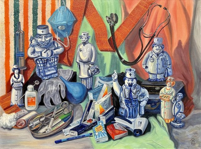 На фото работа автора. Натюрморт доктора. Холст, масло. 60х80 см. 2024 г.