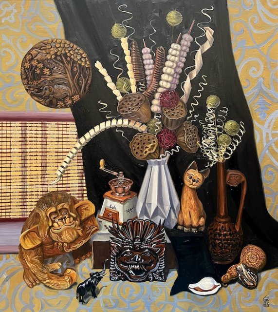 На фото работа автора. Натюрморт с тайской маской. Холст, масло. 90х80 см. 2025 г.