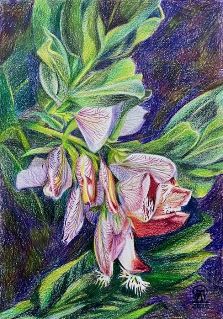 На фото работа автора. Полигала. Бумага, цветные карандаши. 30х21 см. 2025 г.
