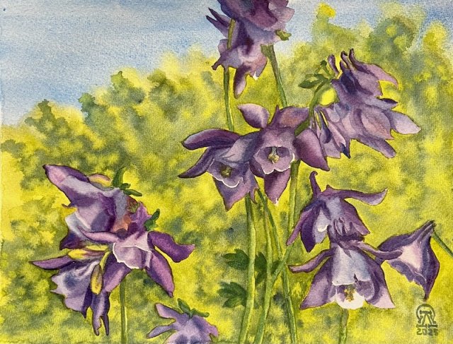 На фото работа автора. Аквилегия. Бумага, акварель. 30х40 см. 2025 г.