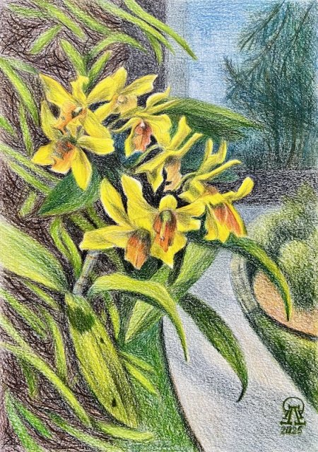 На фото работа автора. Пхукет. Желтые орхидеи. Скетч. Бумага, масляные карандаши. 30х21 см. 2025 г.