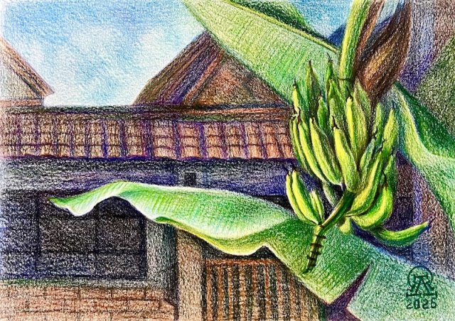 На фото работа автора. Пхукет. Банановая ветвь. Скетч. Бумага, цветные карандаши. 21х30 см. 2025 г.