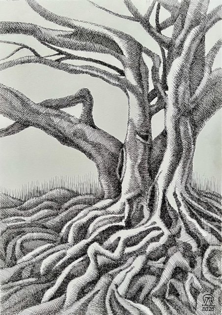 На фото работа автора. Корни. Скетч. Бумага, лайнер. 30х21 см. 2025 г.