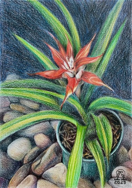 На фото работа автора. Гузмания. Бумага, масляный карандаш. 30х21 см. 2025 г.