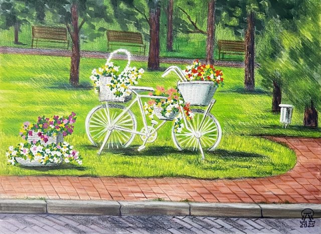 На фото работа автора. Клумба-велосипед. Бумага, смешанная техника. 30х40 см. 2025 г.
