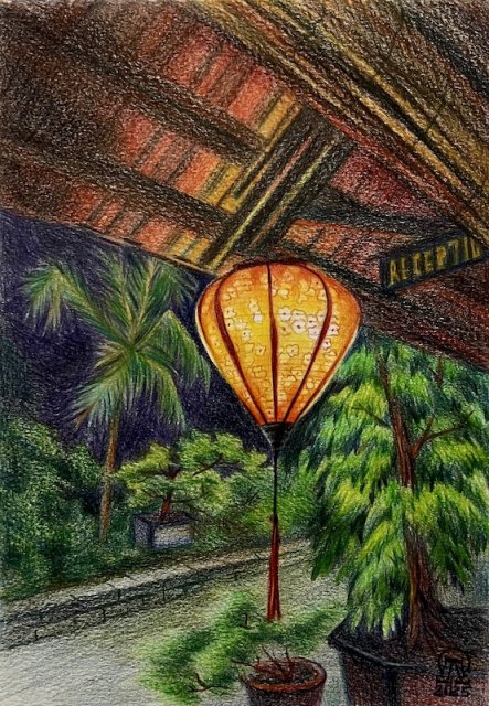 На фото работа автора. Фукуок. Вьетнамский фонарь. Скетч. Бумага, масляные карандаши. 30х21 см. 2025 г.