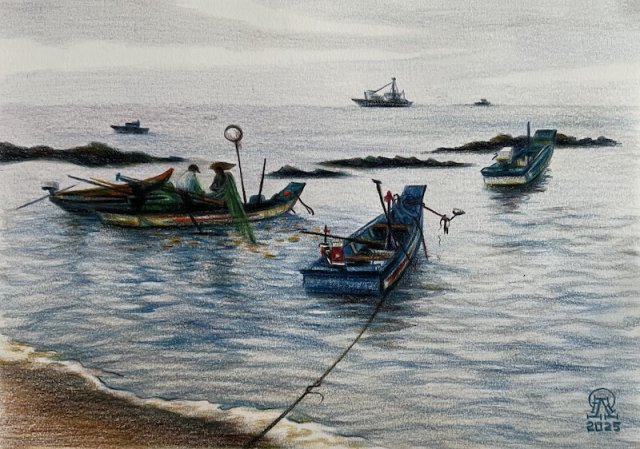 На фото работа автора. Рыбацкие лодки. Бумага, масляный карандаш. 30х21 см. 2025 г.
