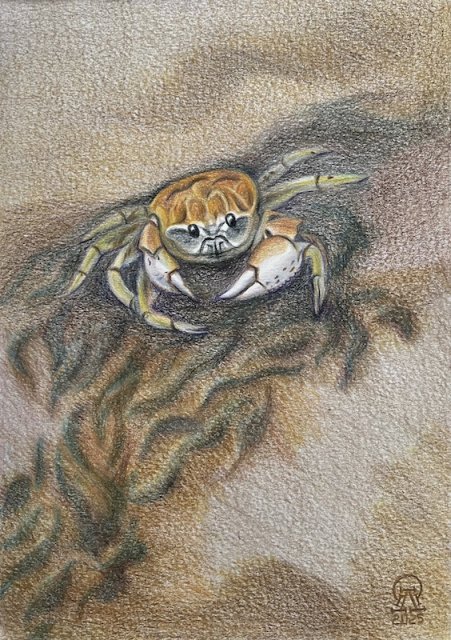 На фото работа автора. Фукуок. Песочный краб. Бумага, масляный карандаш. 30х21 см. 2025 г.